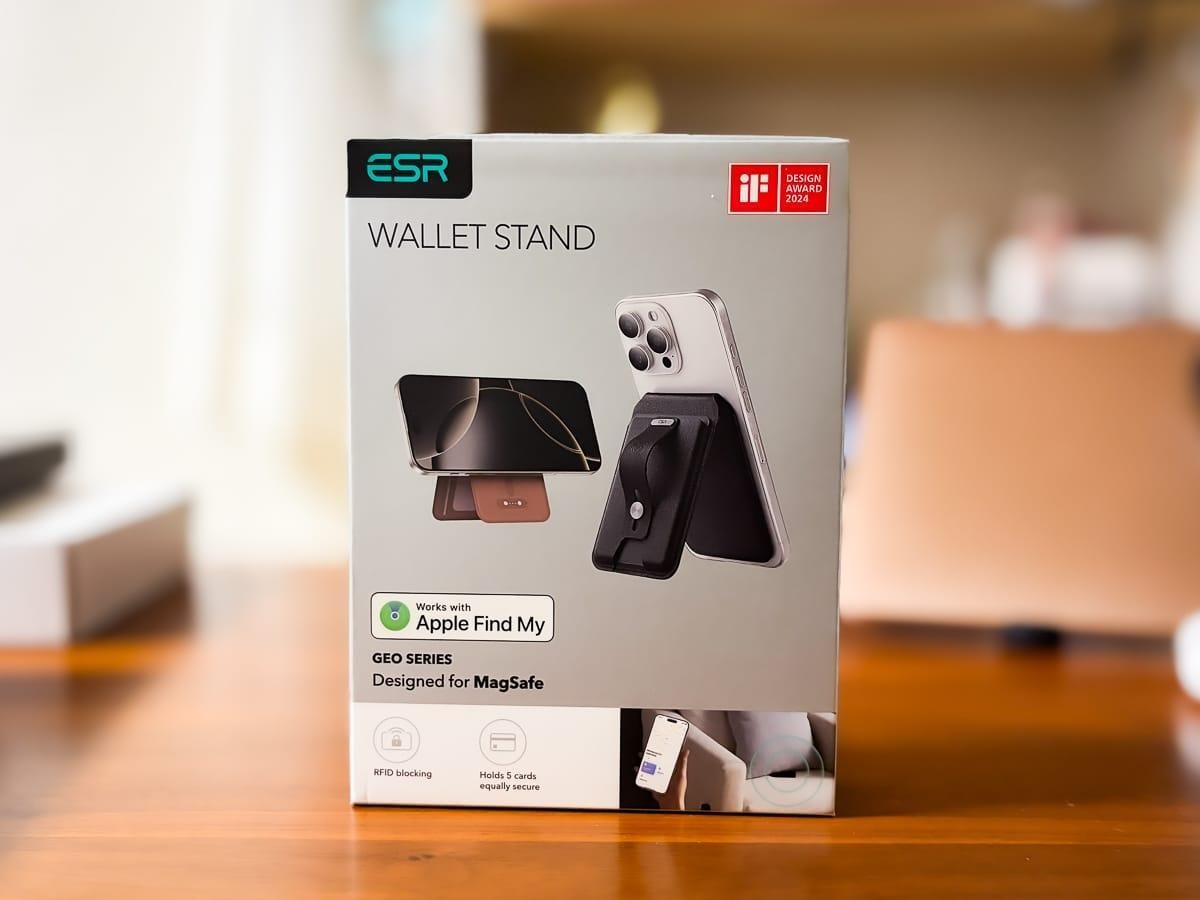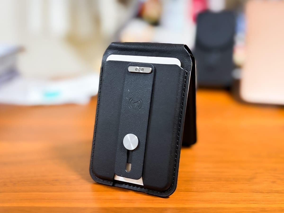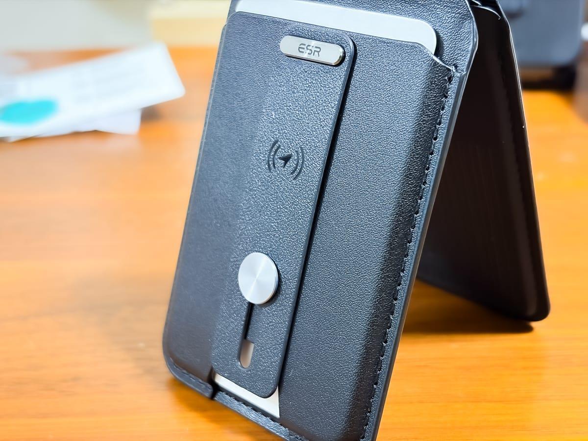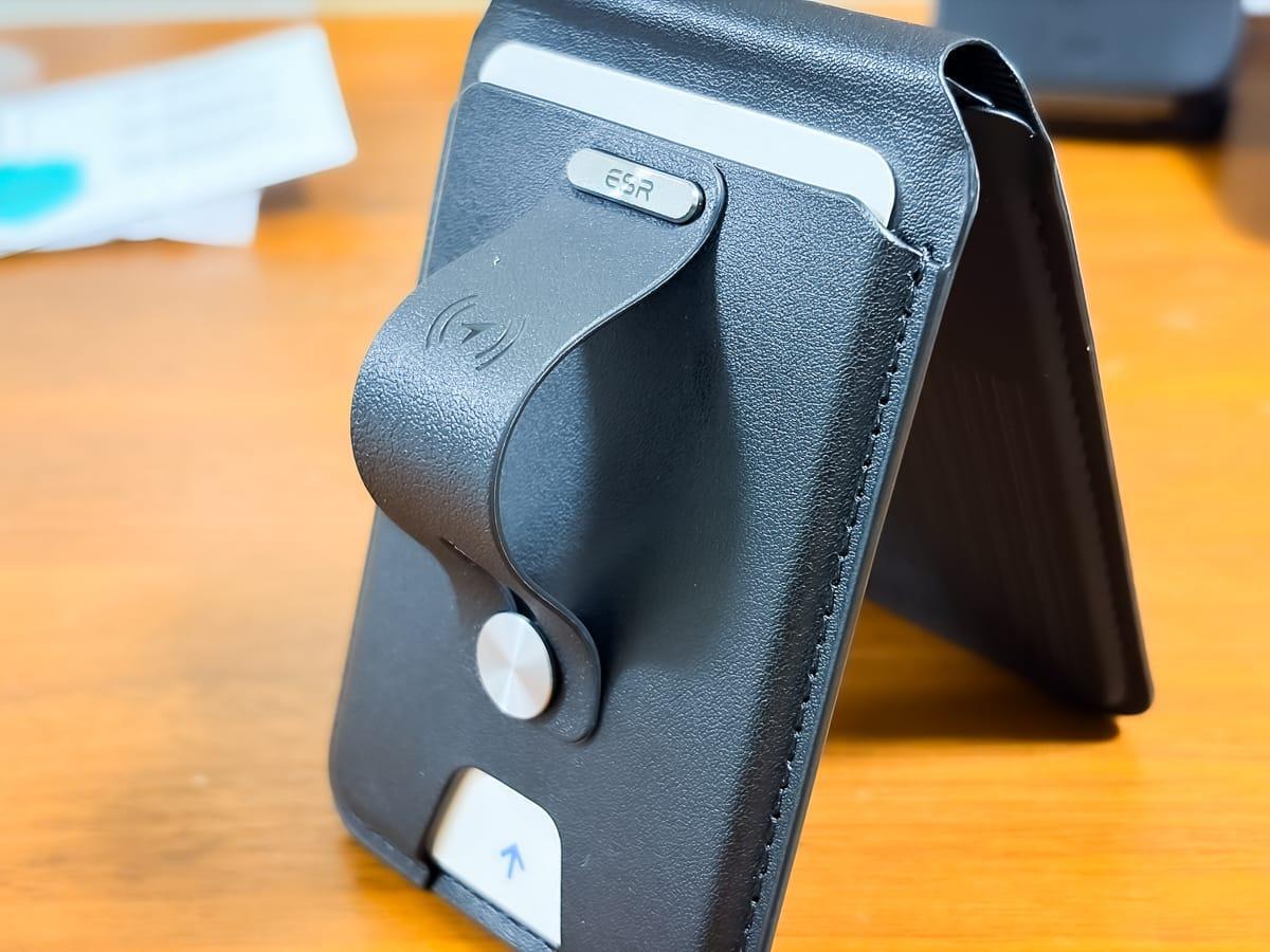 ESRウォレットスタンドはMagSafe対応のiPhone用アクセサリで、背面に装着することで「スタンド」「グリップ」「カードケース」の3役を担う。