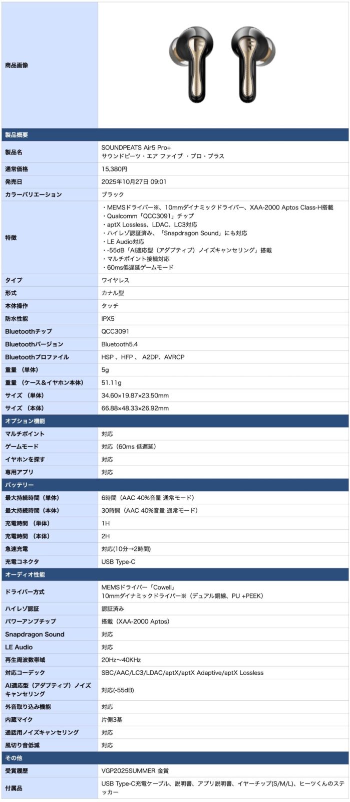SOUNDPEATS Air5 Pro+は、SOUNDPEATSが販売しているイヤホンの中でも最高位クラスのイヤホンだ。